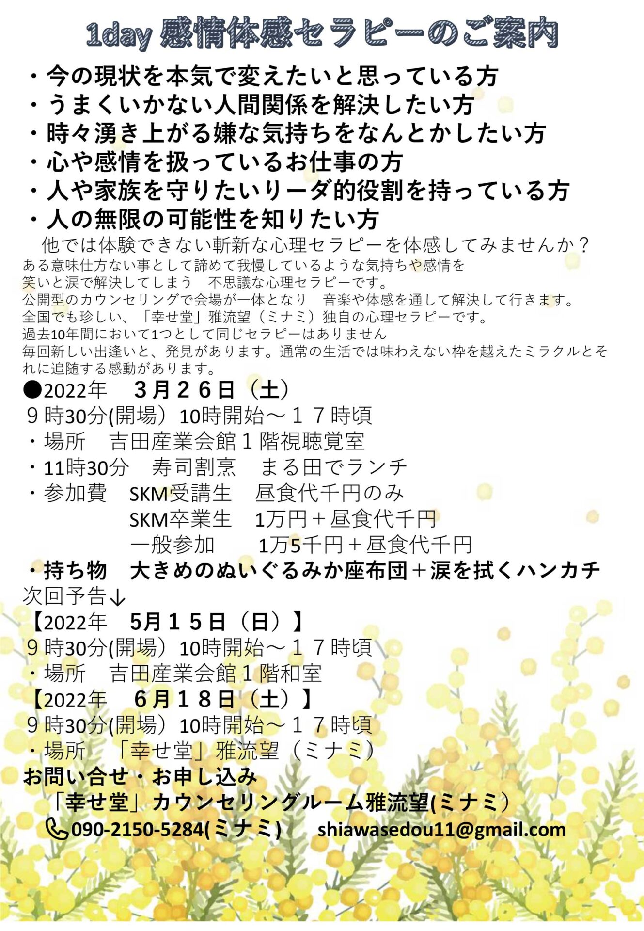この度、新型コロナウィルスの影響を考えて自粛しておりましたが、待望の【1day 感情体感セラピー】を開催いたします。こじれた人間関係や仕方ない事として諦めて我慢しているような気持ちや感情を、笑いと涙で解決してしまう不思議な「幸せ堂」雅流望(ミナミ)独自の心理セラピーです。